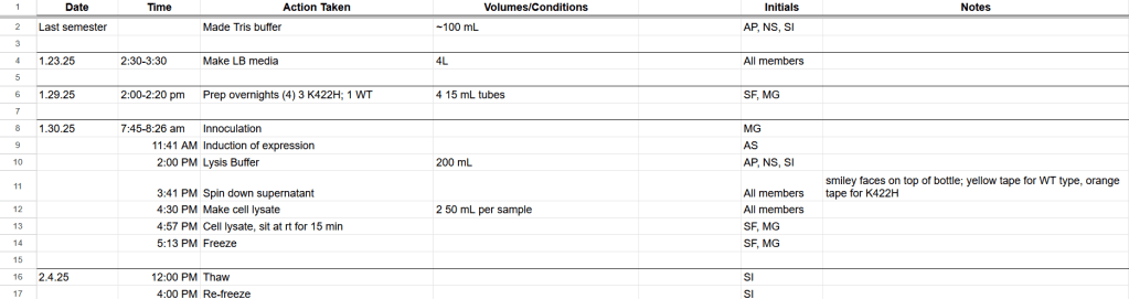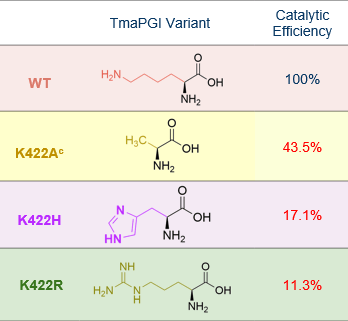 During the analysis stage of this project, my group compared results from the K422H mutation to similar groups focused on site 422 mutations. We identified a relationship between steric bulk at the residue 422 site and subsequent effect on catalyic efficiency of TmaPGI: as the residue size at site 422 increases, the catalytic efficiency, or protein activity, decreases.